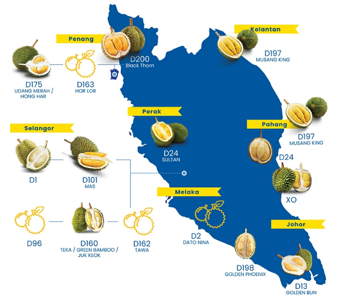 在馬來西亞,大約有200個榴蓮品種有自己獨特的風味和香氣。同時它們也對適宜的生長條件也特定的需要,例如降雨,海拔,溫度和土壤結構。榴蓮僅在成熟季節才有供應那發生在每年的六月和七月。那個時節成熟后從樹上自然掉落的榴蓮,往往會含有較多的果肉和更濃郁的香氣。